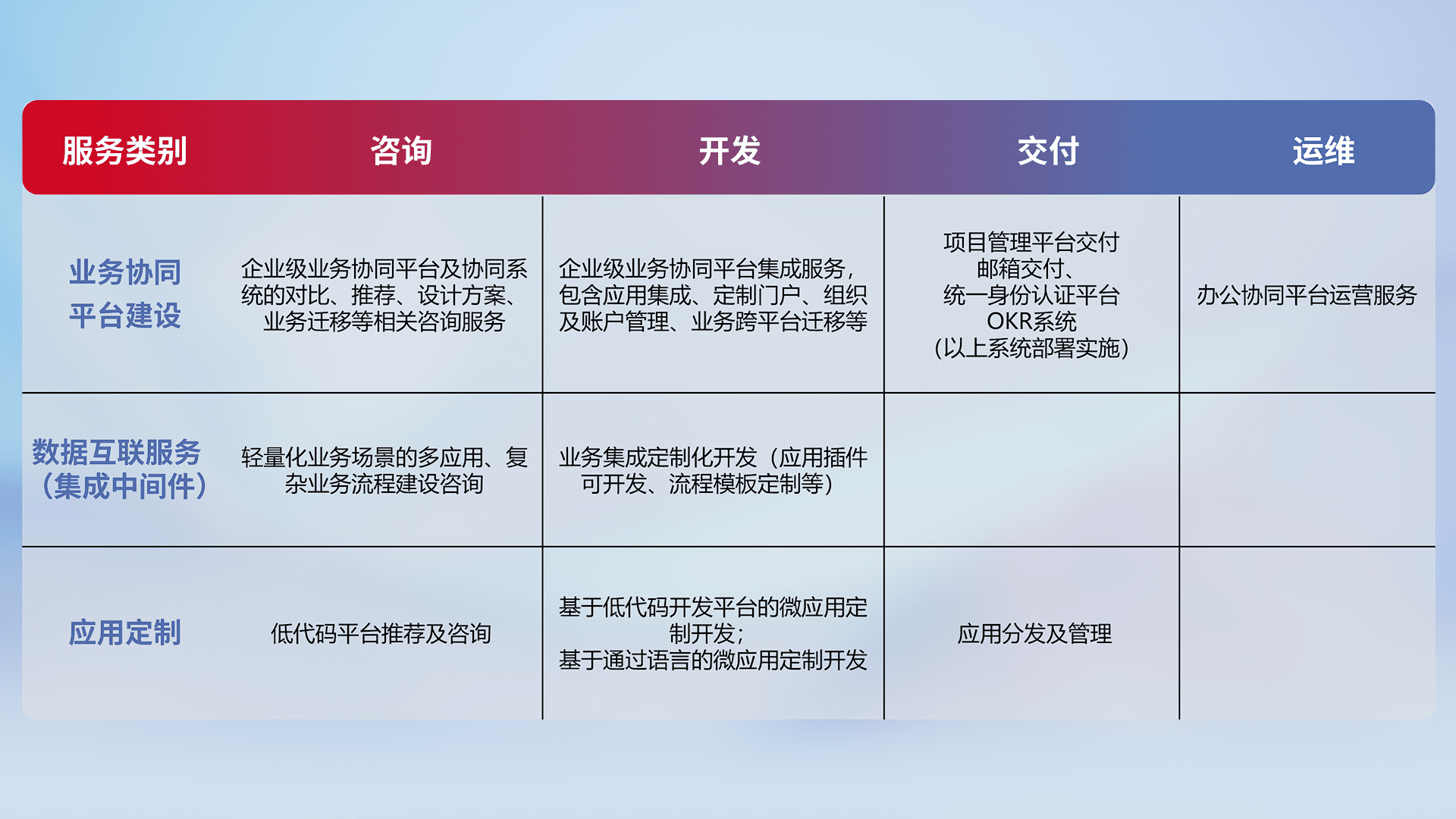 针对钉钉、、、企微、、IDaas等平台级产品提供产品的规划、、方案、、交付、、、、定制化开发等服务,,,,实现如统一协同办公、、、、智能客户服务、、、混合会议管理、、、、智能数据查询、、、等业务场景,,,实现数字化转型。。。。